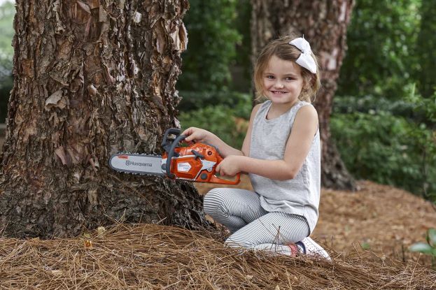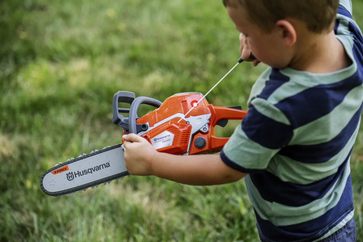 Motosierra de juguete, réplica de la motosierra profesional 550 XP® Husqvarna. Con este juguete, los más pequeños de la casa podrán jugar a ser leñadores profesionales. Funciona con pilas, emite sonido y su cadena se mueve. Fabricada en plástico resistente de alta calidad. Adecuada para mayores de 3 años. No corta.